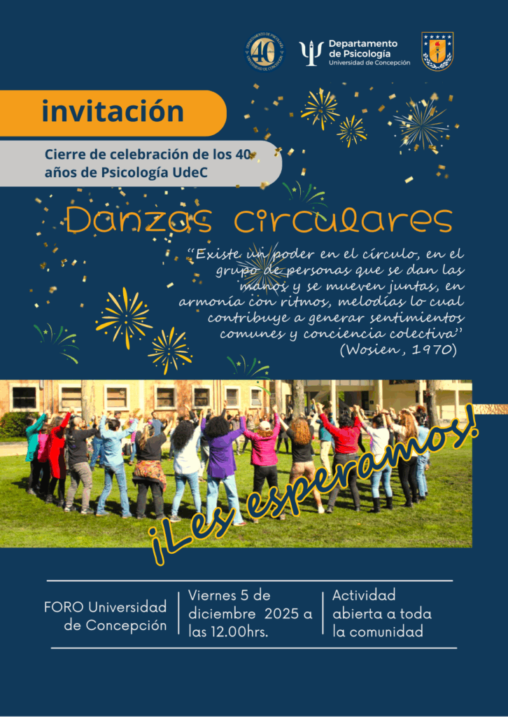 El próximo viernes 5 de diciembre, a las 12.00hrs, en el Foro de nuestra casa de estudios, se realizará el cierre de la celebración de los 40 años de Psicología UdeC con “Danzas Circulares”. Luego de un intenso programa de actividades que se ha ido desarrollando durante todo el año,